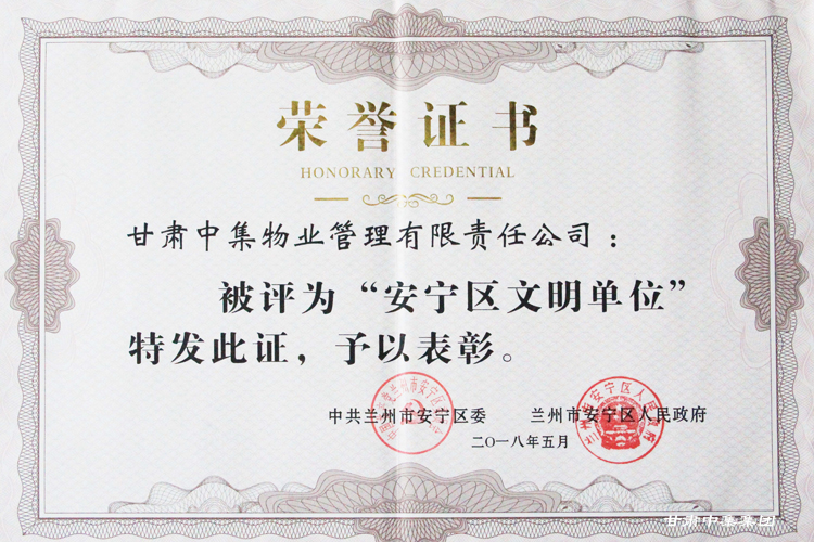2018年5月14日下午,蘭州市安寧區(qū)委、蘭州市安寧區(qū)人民政府在安寧區(qū)政府第四會(huì)議室召開安寧區(qū)2017年度“文明單位”命名表彰大會(huì)。會(huì)上,甘肅中集物業(yè)管理有限責(zé)任公司被中共蘭州市安寧區(qū)委、蘭州市安寧區(qū)政府聯(lián)合命名并授予“文明單位”榮譽(yù)稱號(hào)。