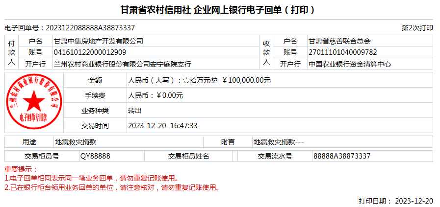 2023年12月20日,甘肅中集集團向臨夏積石山地震災(zāi)區(qū)捐款10萬元。