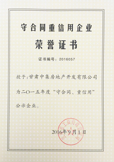 2016年9月1日,由蘭州市工商行政管理局評(píng)選的蘭州市2015年度“守合同重信用公示企業(yè)”對(duì)社會(huì)各界發(fā)布,本次全蘭州市共發(fā)布88個(gè)“守合同重信用公示企業(yè)”。甘肅中集實(shí)業(yè)集團(tuán)有限公司子公司甘肅中集房地產(chǎn)開(kāi)發(fā)有限公司憑借“重誠(chéng)信、謀發(fā)展”的經(jīng)營(yíng)發(fā)展模式,喜獲蘭州市2015年度“守合同重信用公示企業(yè)”榮譽(yù)稱(chēng)號(hào),為甘肅中集集團(tuán)發(fā)展里程再添輝煌。