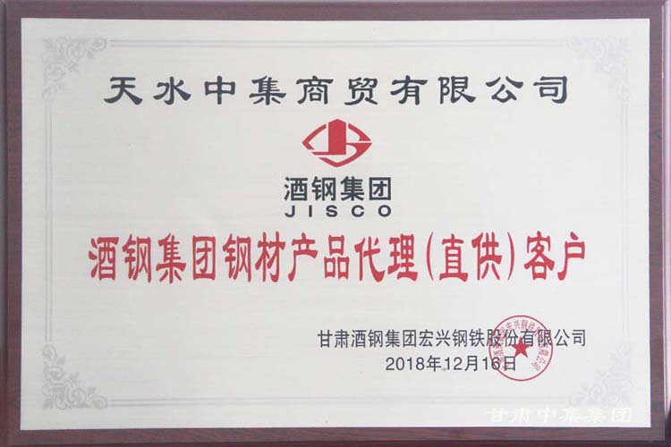 2018年12月12日,甘肅中集實(shí)業(yè)集團(tuán)有限公司及下屬子公司蘭州中集商貿(mào)有限公司、天水中集商貿(mào)有限公司榮獲“酒鋼集團(tuán)鋼鐵產(chǎn)品代理(直供)客戶”及“2018年度金牌代理商”殊榮。